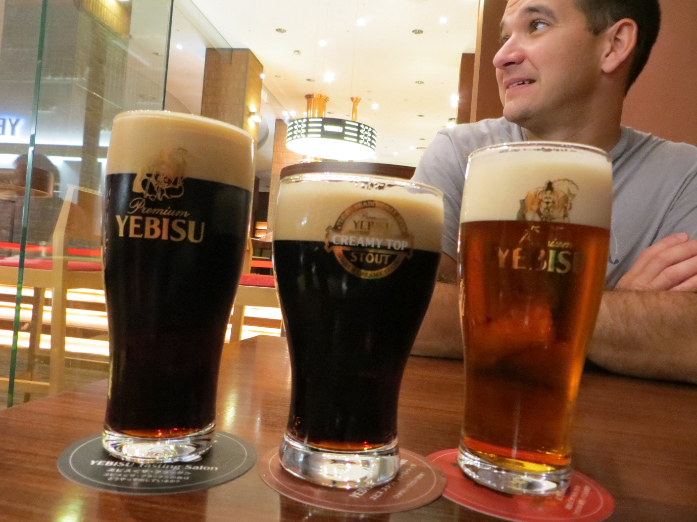 We dropped into the Yebisu beer museum. Yebisu is one of the oldest brands of beer in Japan, and their methods are German in origin. There was a brief gallery showing their bottles throughout the company’s lifetime, as well as marketing material and photos from the past. They provided a brief history of the brand, ending at the ‘tasting salon’, where we grabbed a beer each to sample and share. It was a good time, but unremarkable if you’re not a brand enthusiast. We headed from there back to the hotel to grab our things.
