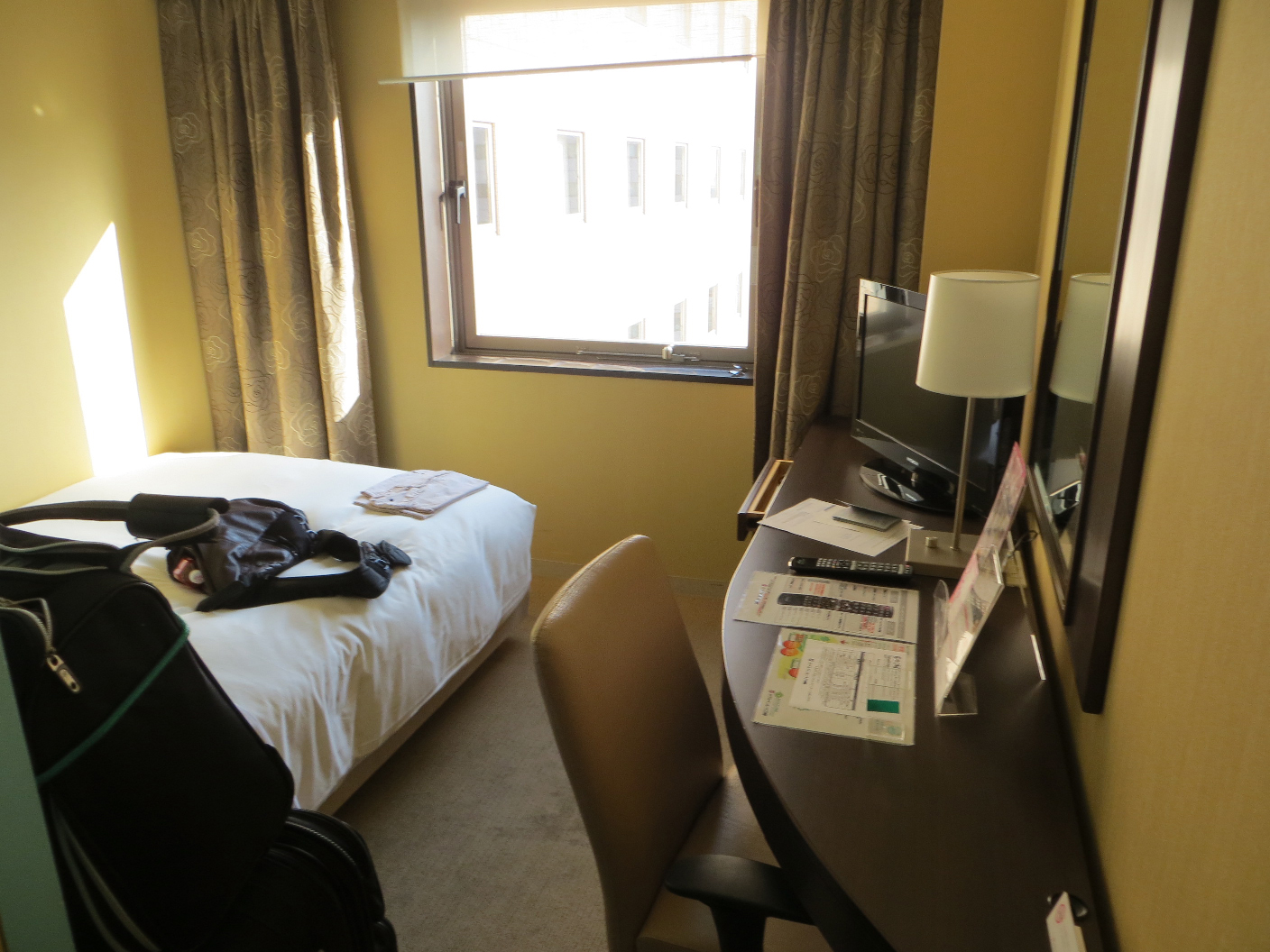We hopped a cab from there and headed to the train station. We hopped a rather comfortable express train and headed to Kawasaki. A short walk from the station and we hit our hotel. We’re staying at the Sunroute Kawasaki. It’s a reasonably sized room, and the bathroom is actually the biggest from any of the Japanese hotels we’ve stayed in.