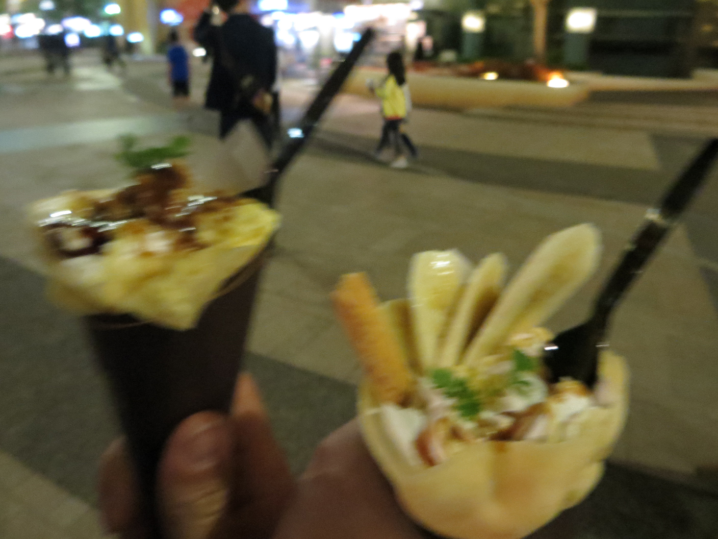 We eventually headed back to Rachel, and then the three of us headed out for dinner. We found a Thai restaurant in a 7 floor mall, and dropped in. I was terribly excited to find a mango lassi on the drink menu, and picked a platter of fried fish in a spicy sauce for dinner. After we finished up, we dropped in to a shoe shop where Rachel picked up some insole padding for her shoes. We wandered around the shops a little longer, and found a crepe cart aptly named “She loves Crepes.” Rachel concurred, and we picked up dessert. There was a handful of flavors to choose from, and I went with caramel banana. Some serious craftsmanship went into the presentation, and the flavor matched that care. Satisfied, we made our way back to the Sunroute. We had a brief pit stop in a 7-11 since my wallet was getting thin.