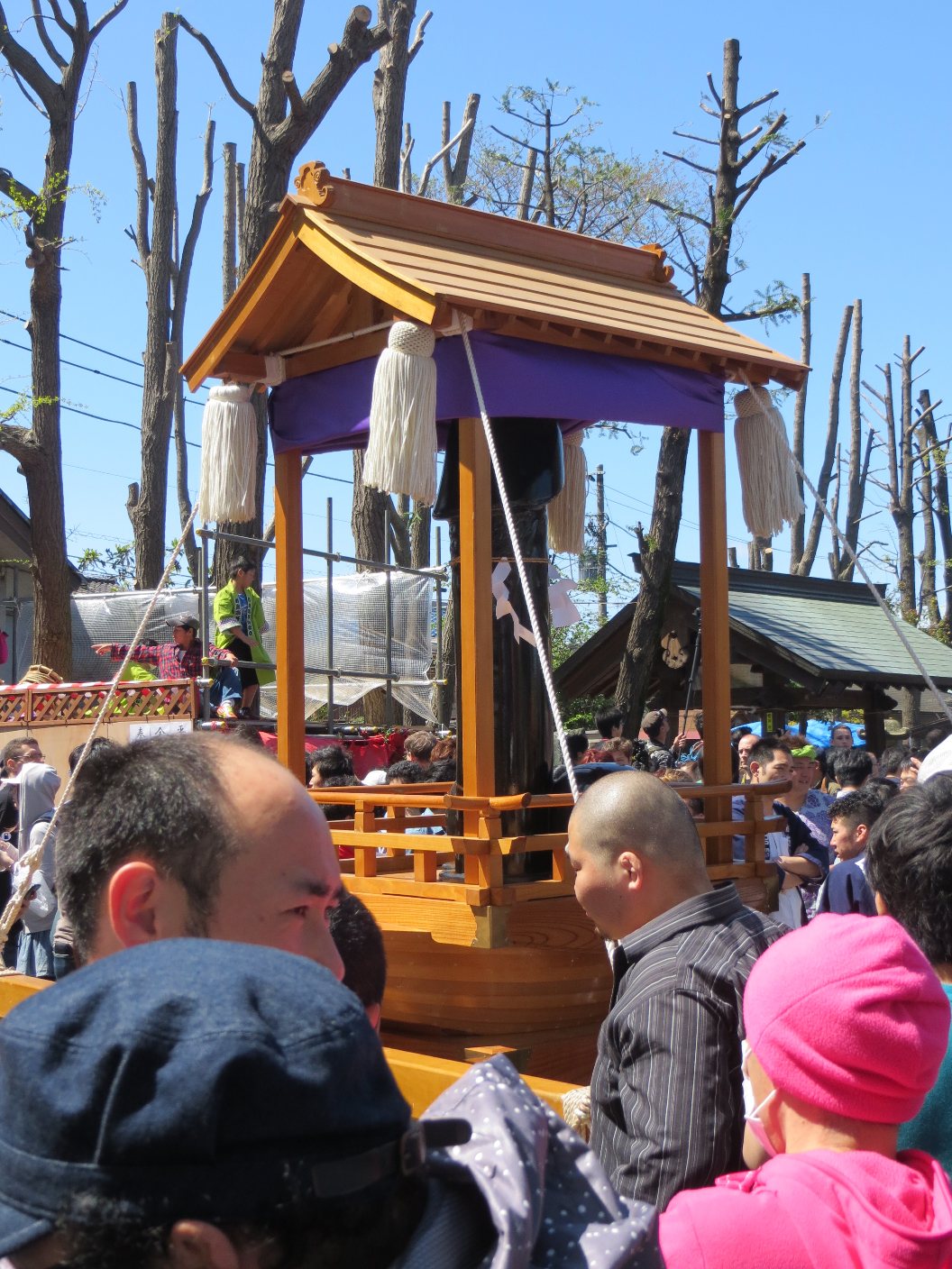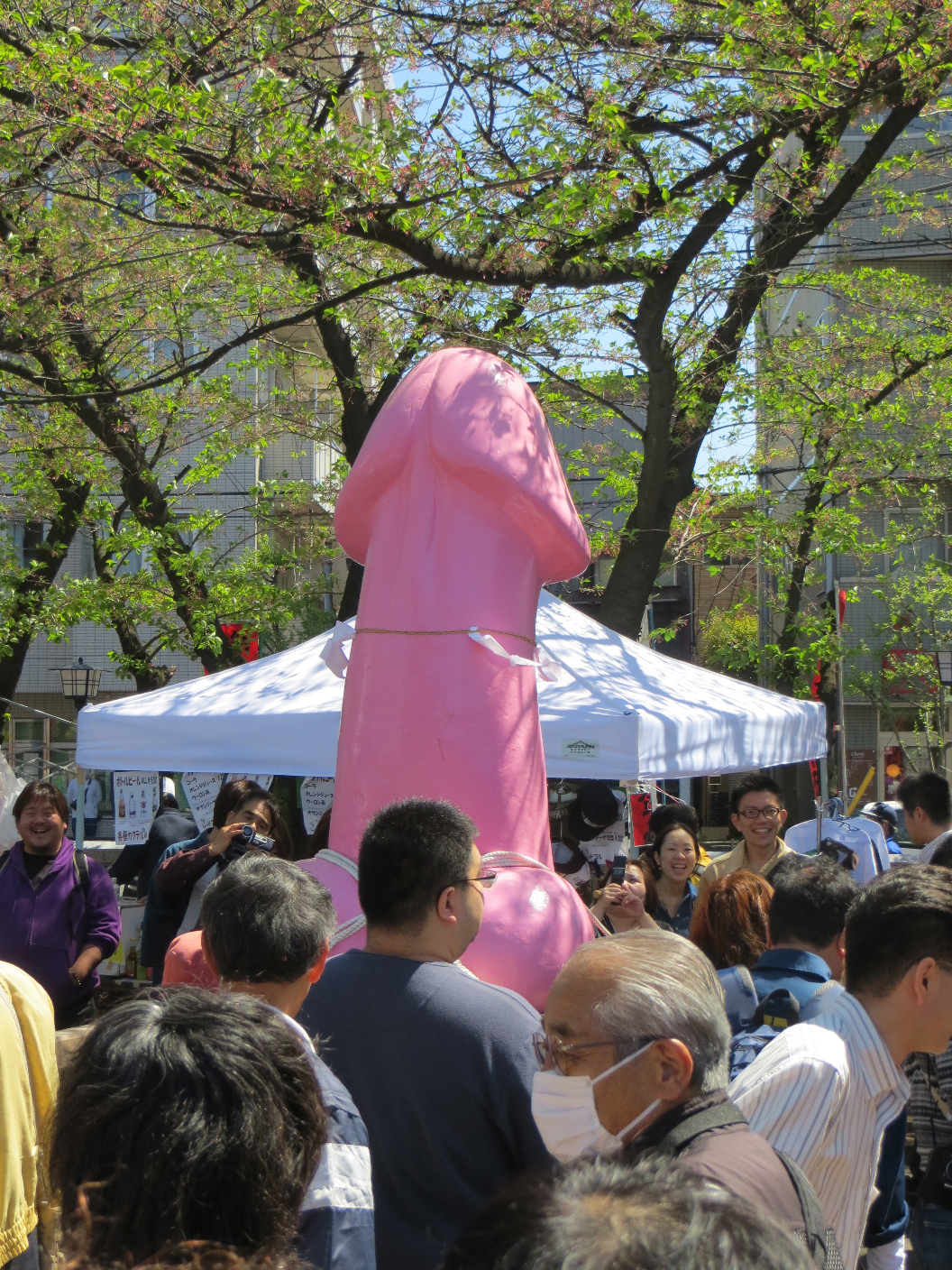 Our last planned activity was to attend the Kanamara Matsuri. In English, that’s the Festival of the Steel Phallus. A wondrous celebration of the male organ, it’s also a major tourist attraction. The number of foreigners matched, if not outweighed the presence of locals at the shrine. The place was packed, wall to wall. It was an ordeal even to move from stall to stall. There were stands selling all kinds of trinkets and foods, all of which fit the theme of the festival. Of particular note were the novelty noses, wood carvings, and the wide variety of penis shaped lollipops. We wandered about, ever so slowly, checking out the giant penis statues on portable shrines. There was also a performer with a monkey. Might have been a macaque, but I couldn’t say for sure. The poor thing did not look like he wanted to perform, but eventually went through his routine. There was also a band of percussionists, accompanied by a flute. At noon, the parade began. Participants marched the portable shrines out of Kanayama and down the street, followed by a huge crowd of other people. I lost Evan and Rachel for a moment so I chose a corner and relaxed. I enjoyed a bit of people-watching, including an officer losing his hat in the wind. Once everything cooled off a bit, they gave me a ring on the phone they lent me, and we met up again.