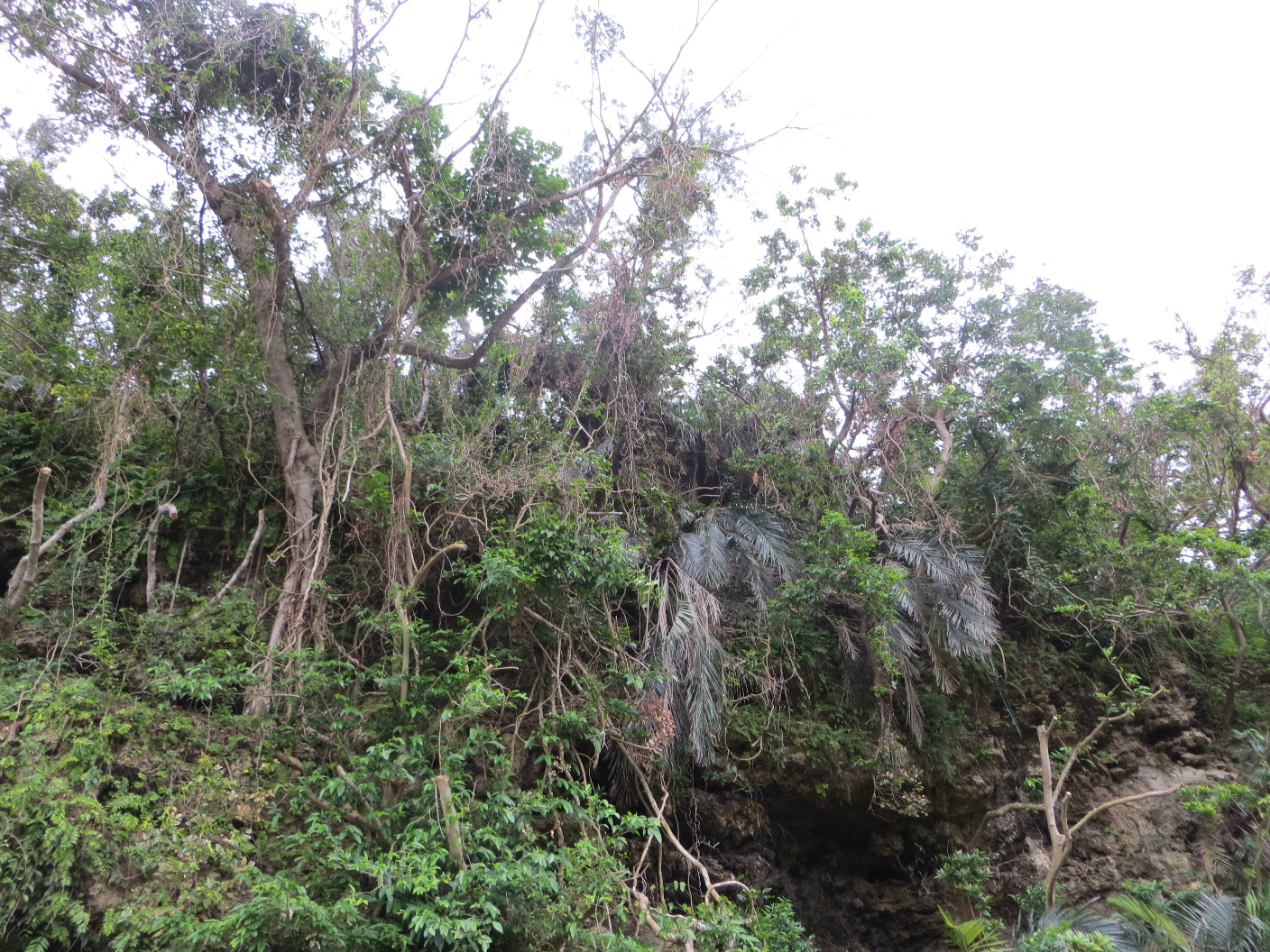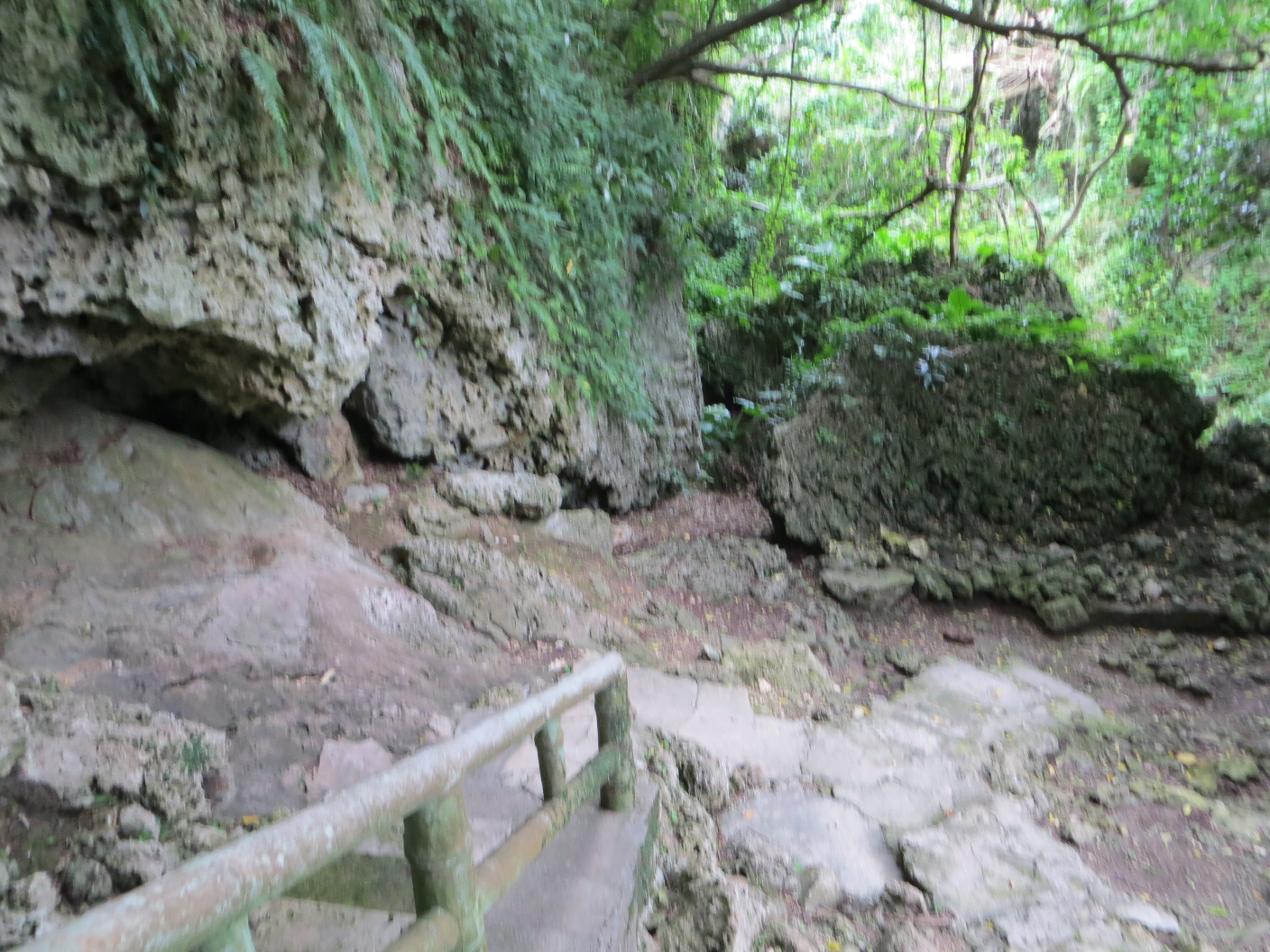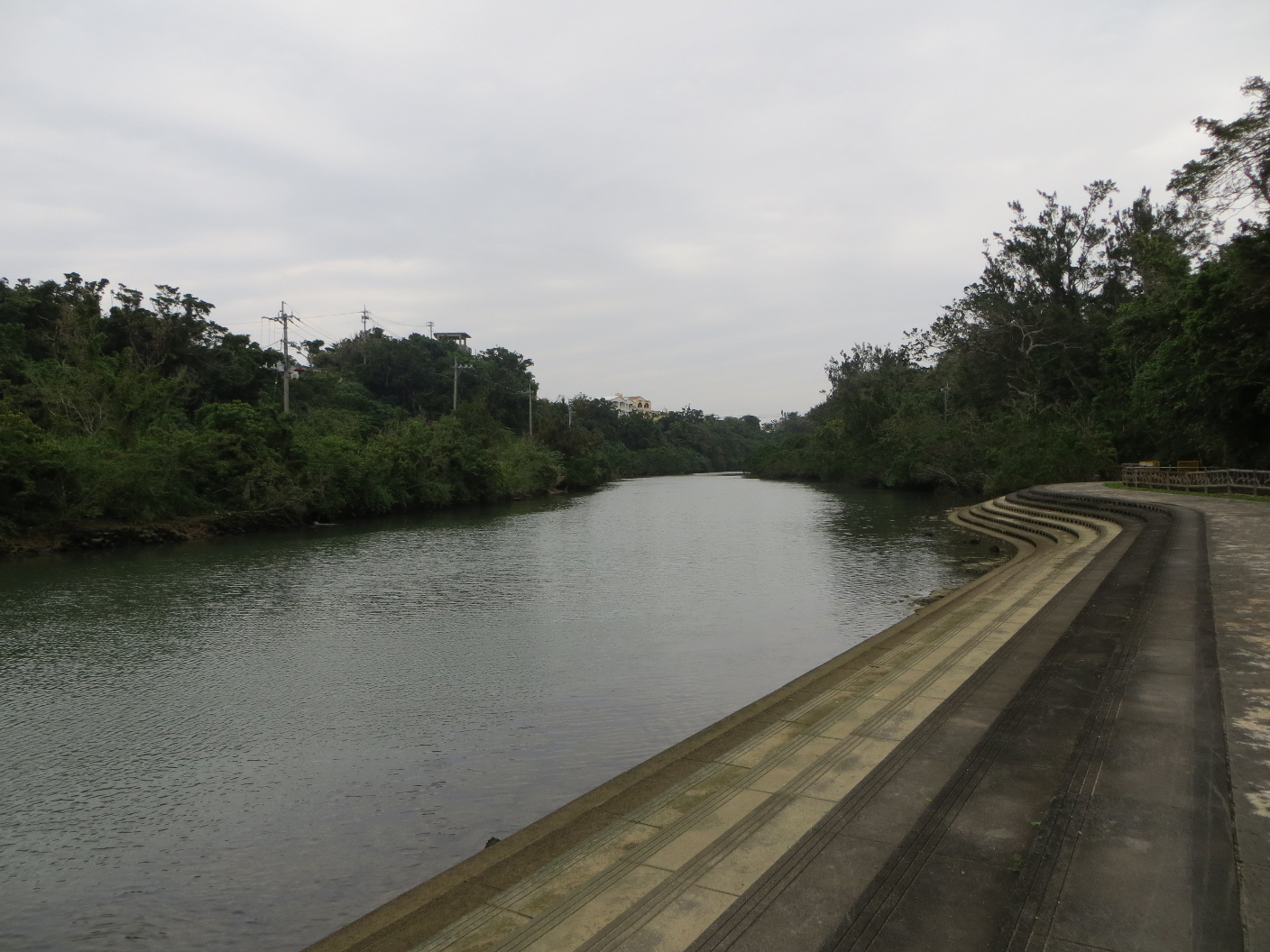 Next we headed to Red Bridge Road, and parked a little beyond the Yomitan red bridge. There’s a walking path beneath it, and we took a stroll down it. There was a small river to one side, and a beautiful plant-covered cliff face on the other. It would have been awesome to climb around, but the risk off poisonous critters or habu snake encounters was enough to prevent any attempts to do so. About halfway down the line, we came to a bend. There were three small black dogs on the path. They didn’t make a sound, but ran off towards the water and behind a rocky outcropping. When we came around to their side, there wasn’t a sign of them. Not so much as a claw on stone could be heard. There appeared to be a cave in the rock, so they could have hidden there, but you never know. We finished up our walk a little further down the road, and then headed back to the car.
