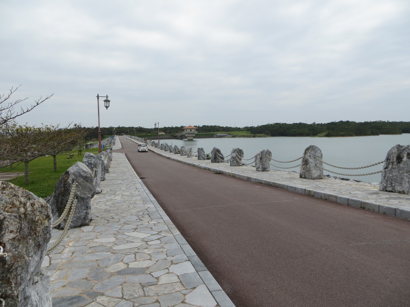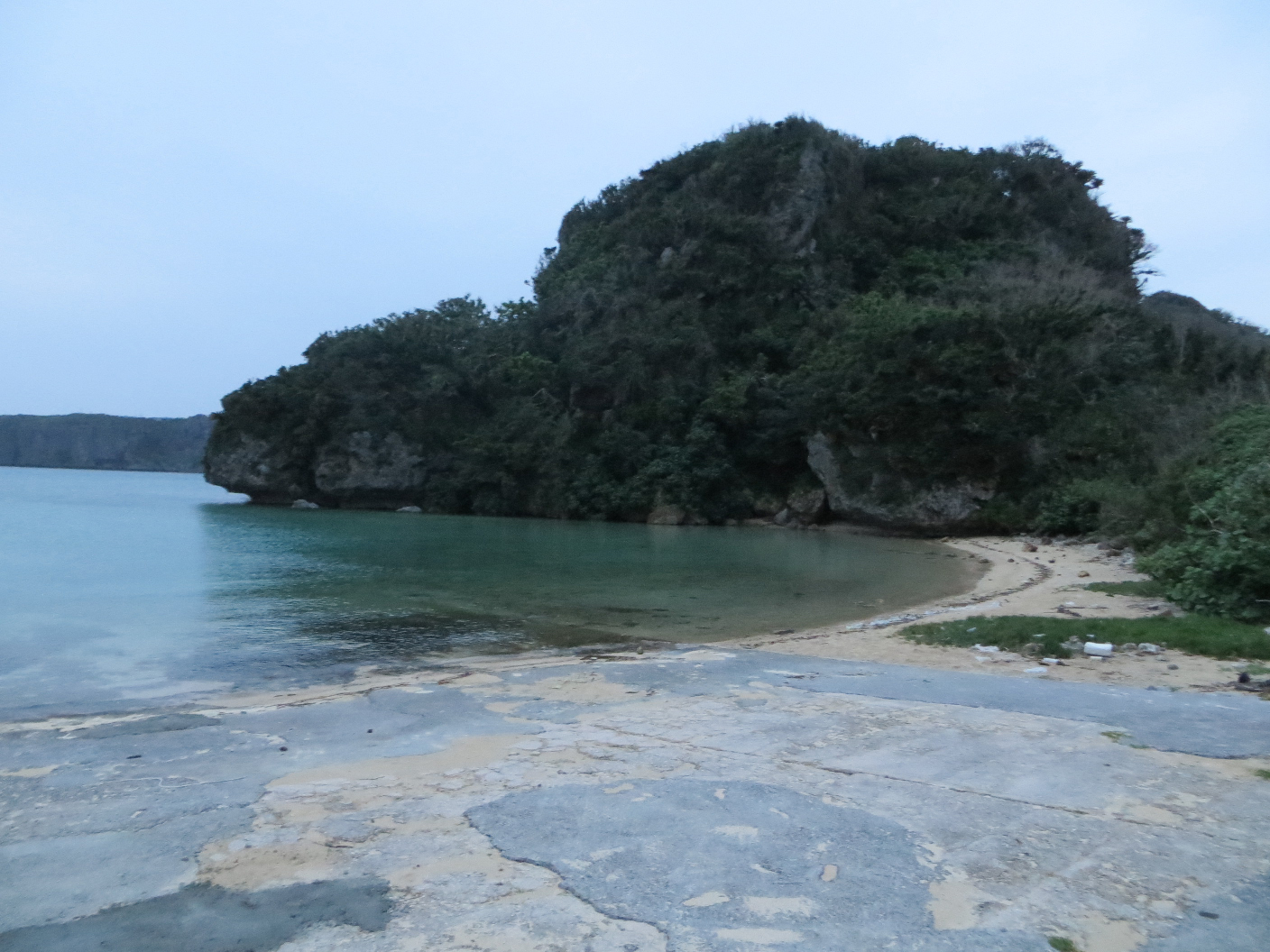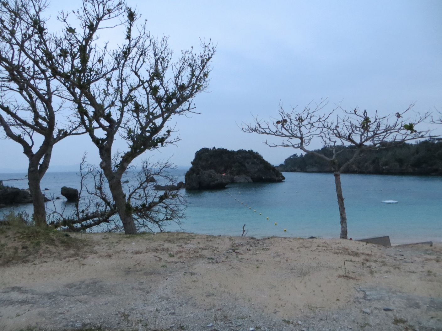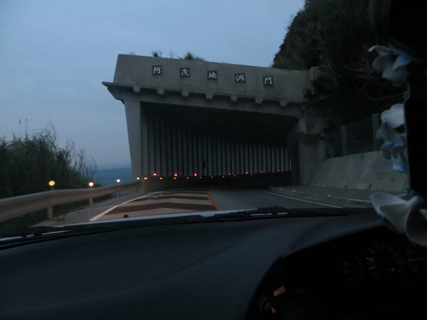 From there we headed towards the Katsuren Castle ruins, but it was closed by the time we got there.  Not to be deterred, we headed down the road further, south then east. We headed out via some pretty significant bridges to nearby islands. We drove through Henza island, Miyagi island, and finally ended up at Ikei island. We passed some cool tunnels (of sorts) which appeared to be rock-slide preventative measures and/or designed to keep cars from plummeting into the water. Not sure which. There were some gorgeous vistas as we passed through the countryside, and once we got to Ikei, there was a small beach. It was closed, likely because the weather wasn’t much good for it. But we were able to take a couple photos and peek around. It was a gorgeous area, and I’m sure it’d be even more so if the weather was nicer.