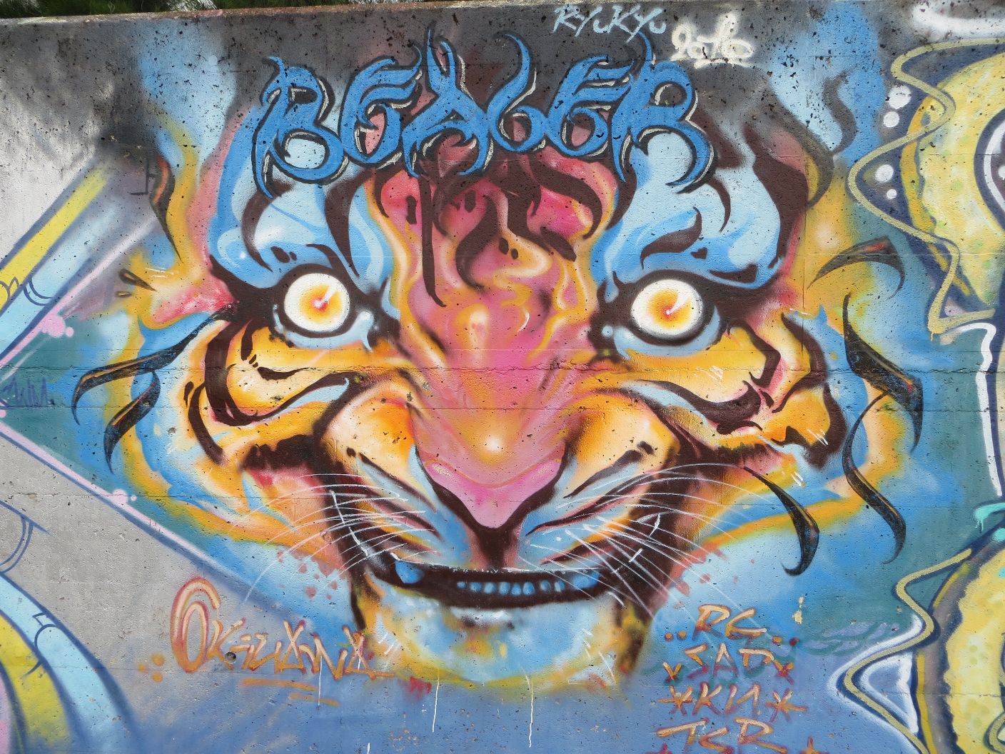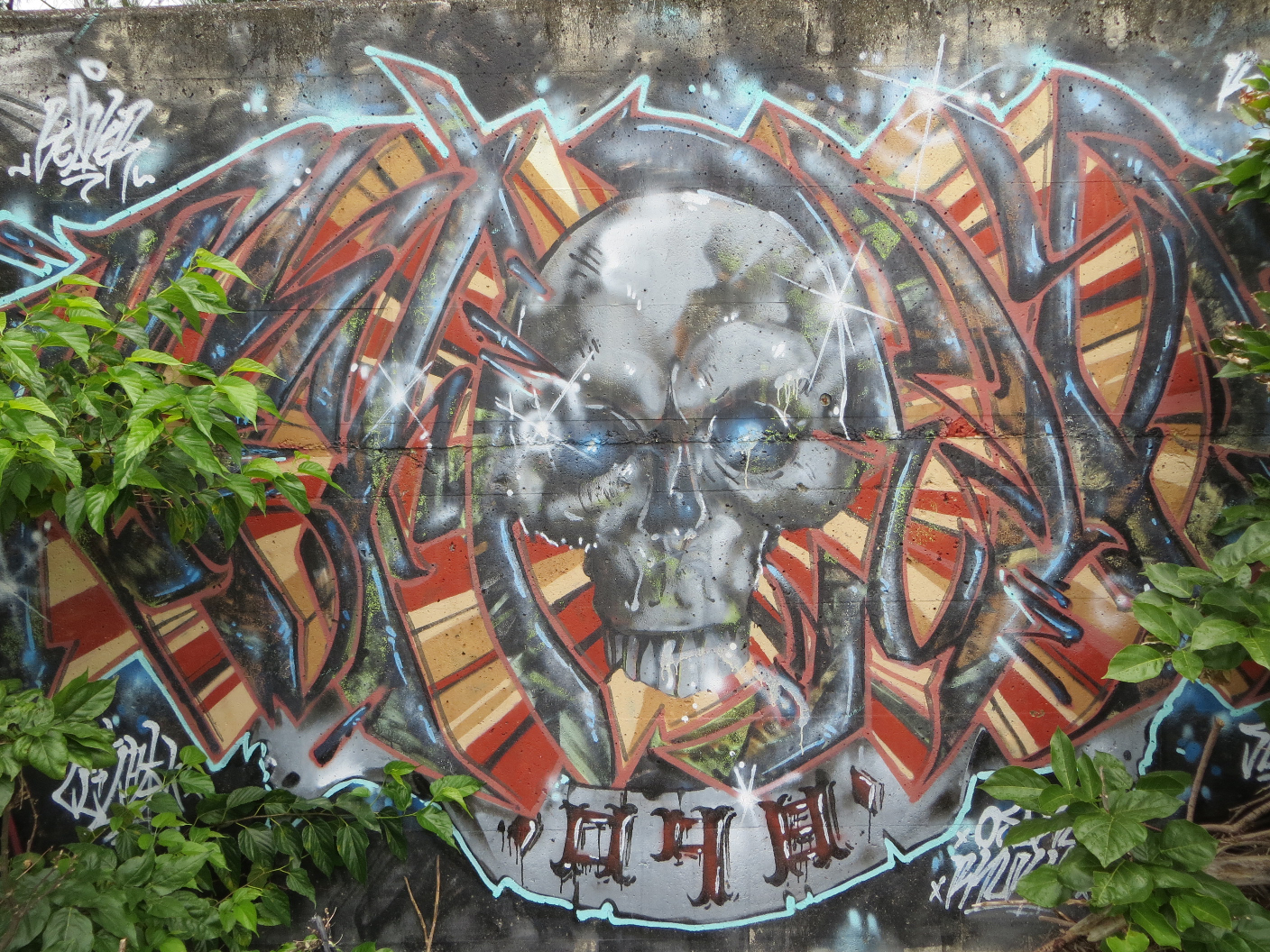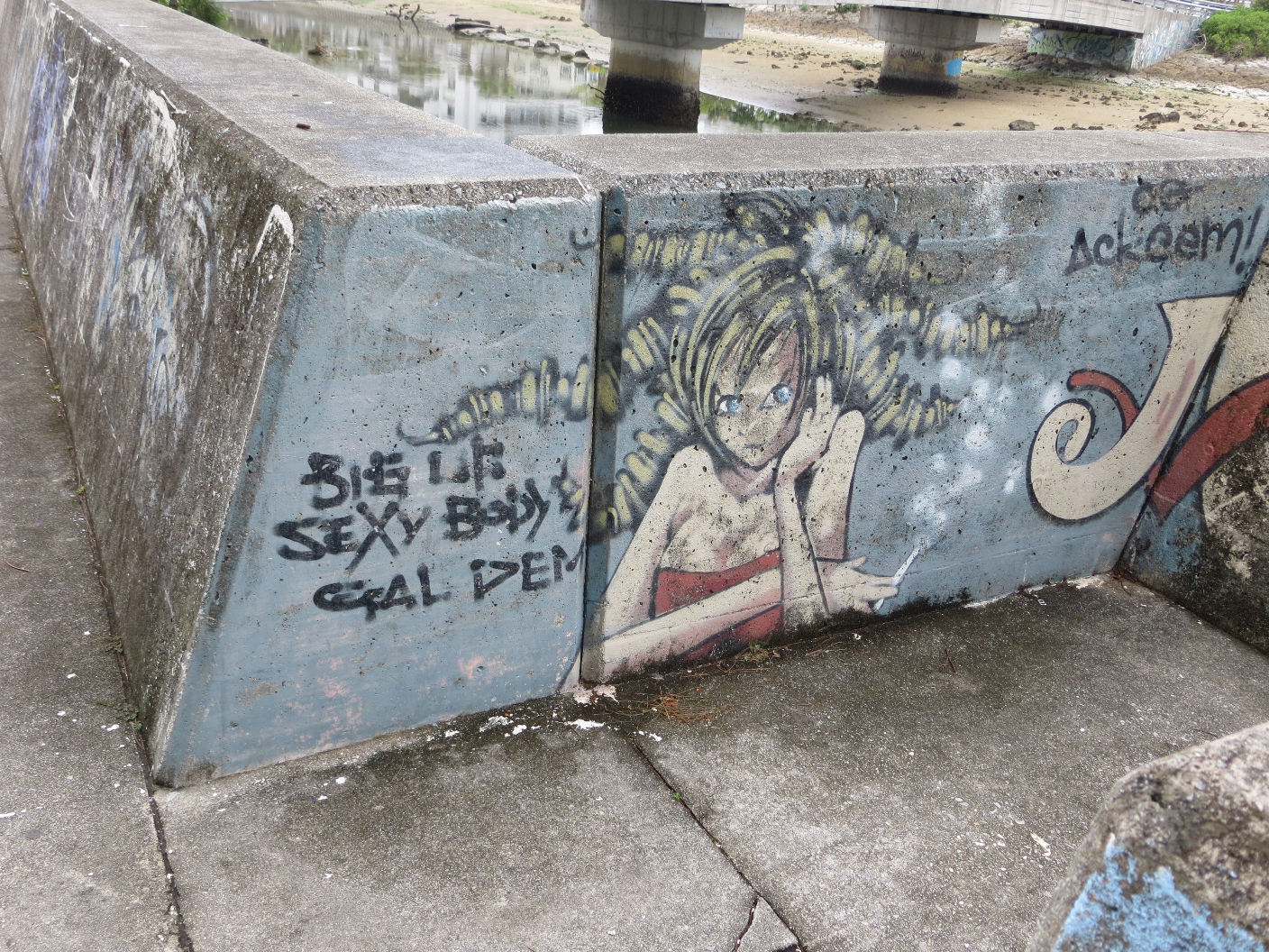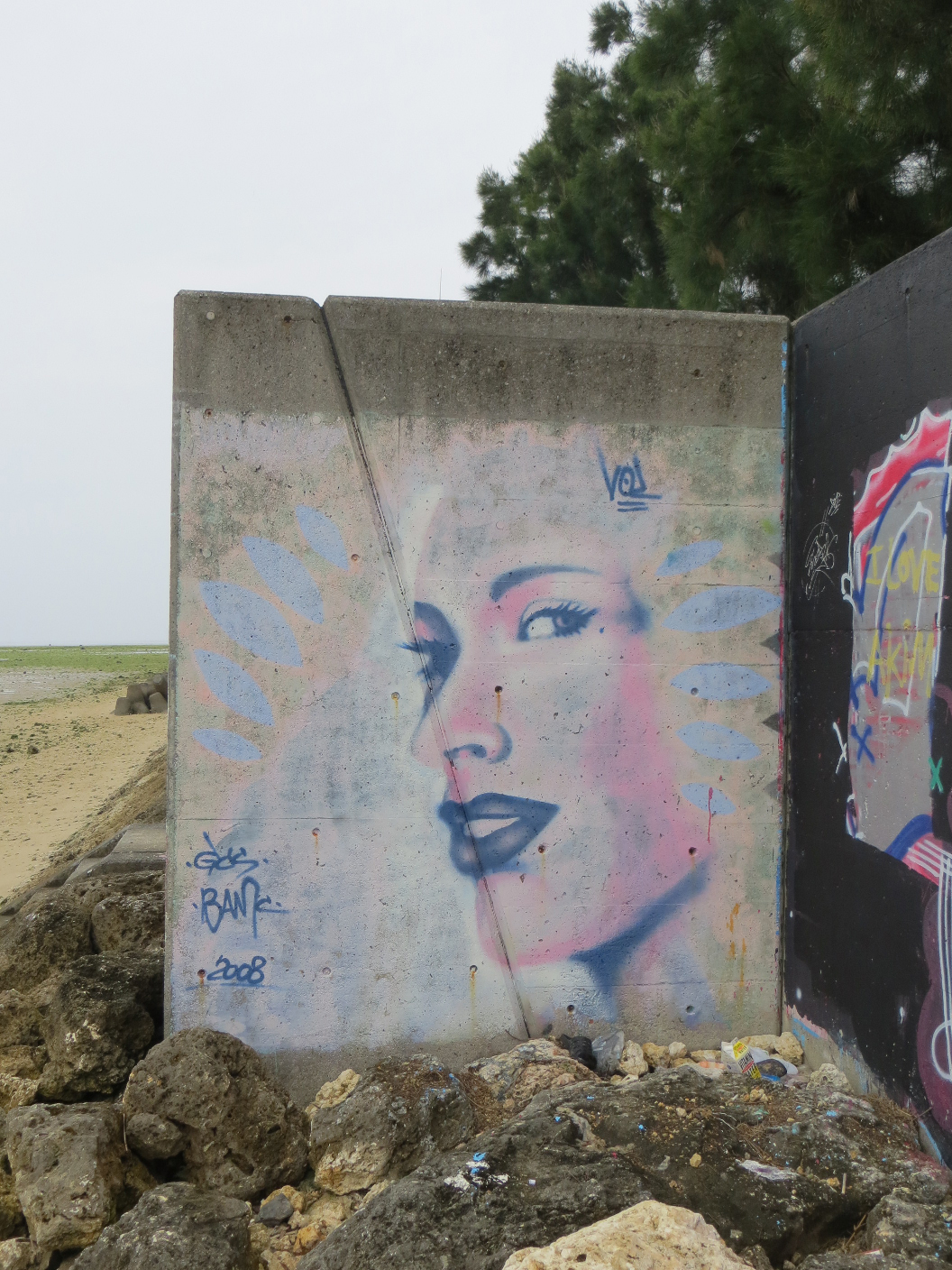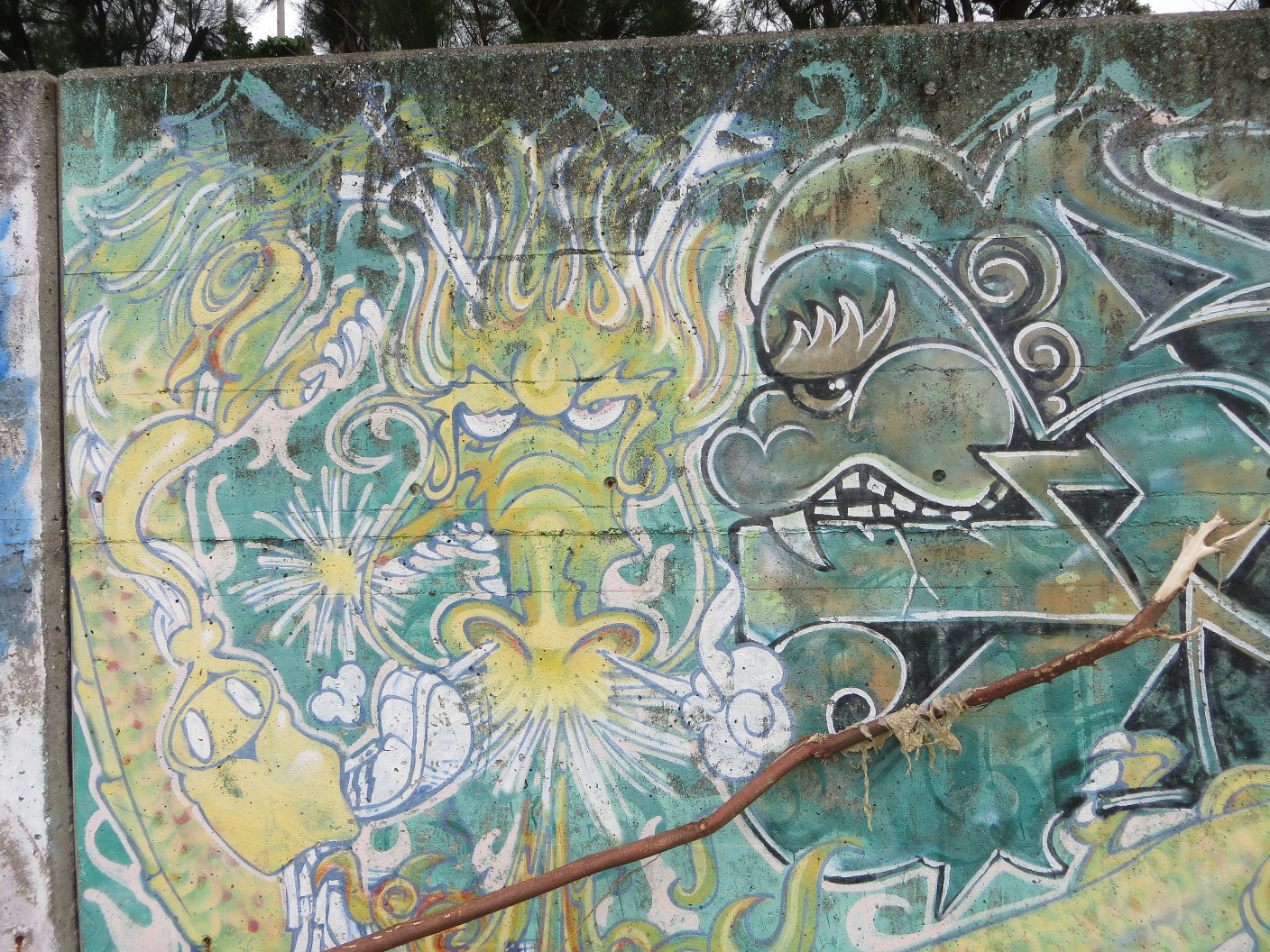 About noon the rain had subsided enough and I had finished the drawing I was working on. I ventured out the door and down to Araha beach. There was still a little drizzle falling, so I set up camp on a stool at a covered table. I set my things down, pulled my ukulele out of the case, and played songs for myself while watching a wake boarder jump around. After a while, the rain stopped. I decided to take the opportunity to walk the sea wall and see if there was anything going on. Along one part of the wall, there was a series of intricate graffiti pieces. I walked along the rocks and snapped a few pictures of my favorites. It’s really a style I’d love to learn how to do. After walking the length of the available seawall, I settled back into place at Araha and played some more ukulele. About this time, Evan called. He was going to pick me up and we were heading to Maeda Point for some snorkeling.