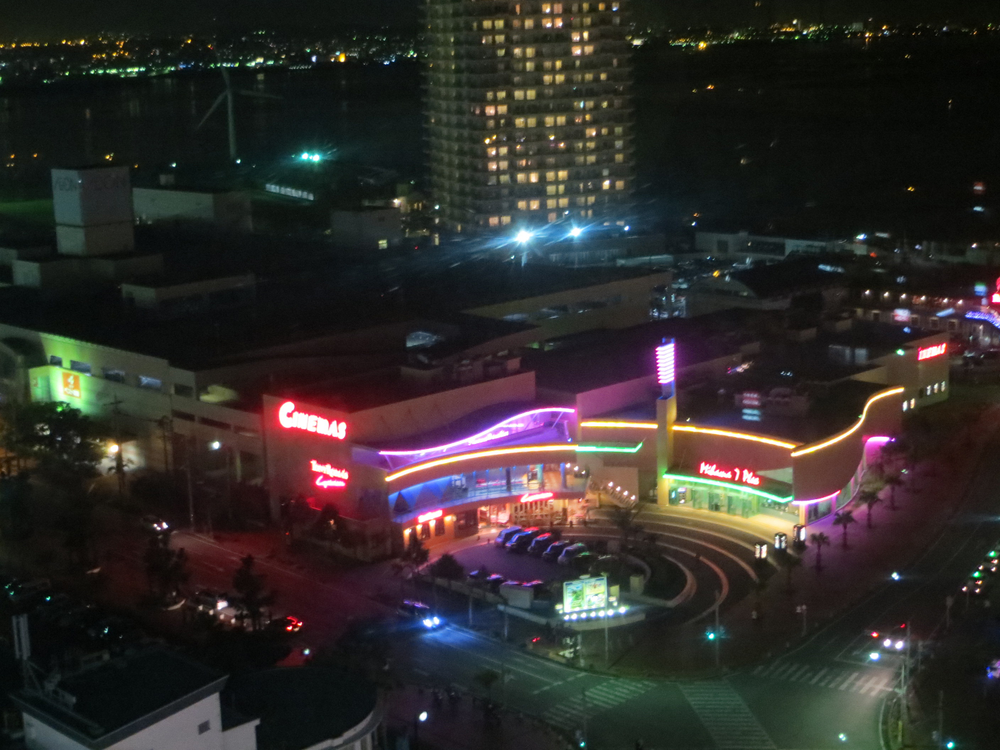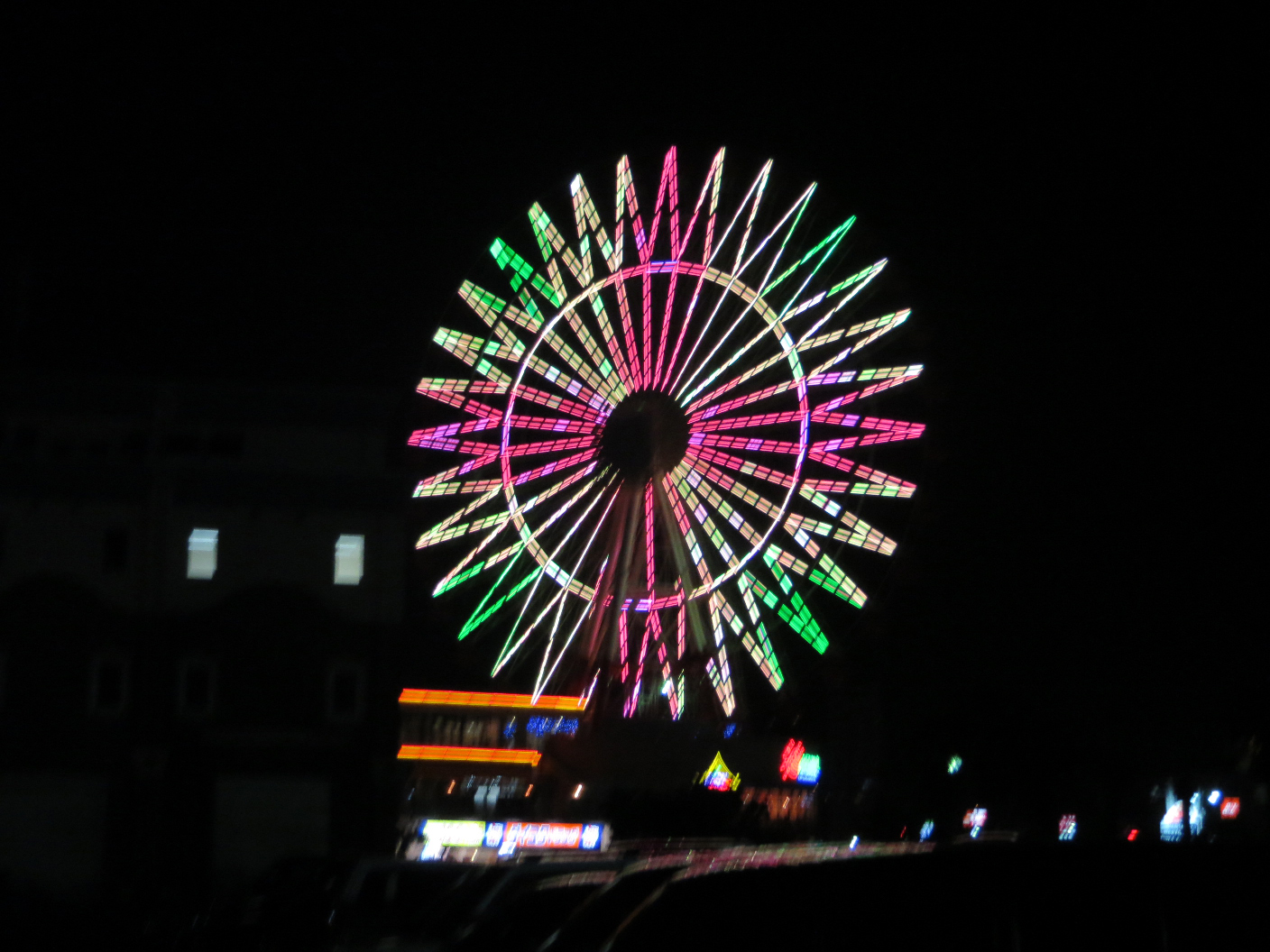Afterwards, we headed out to the big ferris wheel in the shopping center across the way. We got our tickets and enjoyed the 15 minute ride around the wheel. I snagged a few shots from the top, but the reflections of the neon and dirty, scratched windows made it a bit hard. Still, I could see the lights of the city for a few miles, and it was a lovely night.