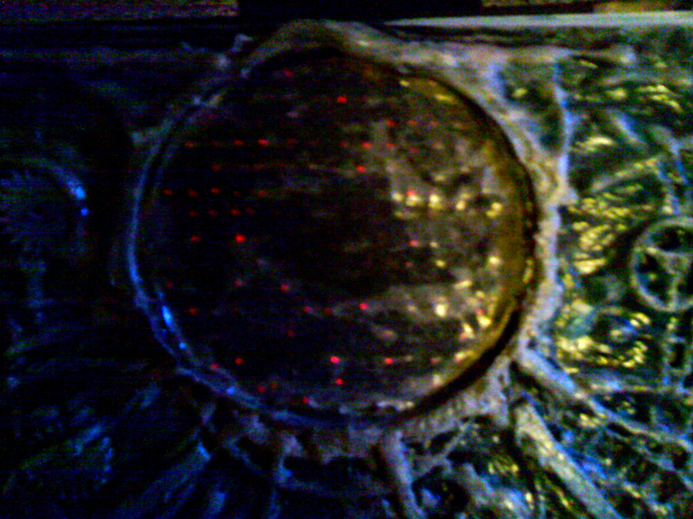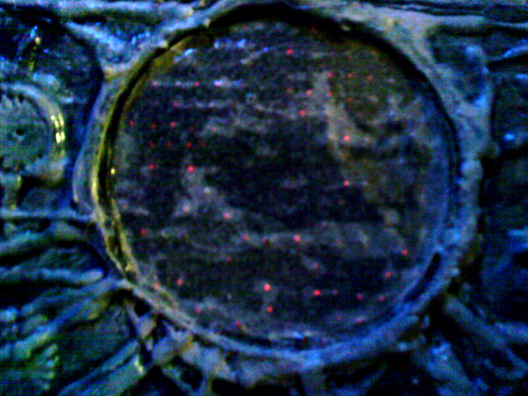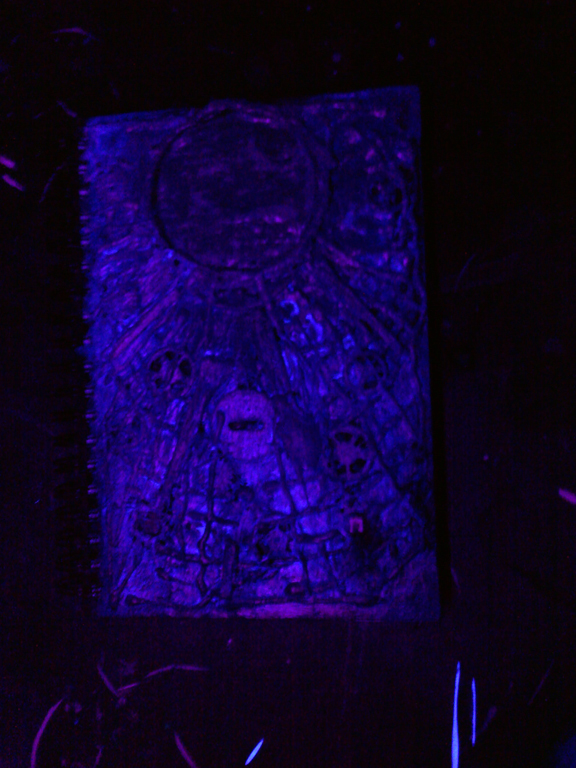 My new sketchbook cover has been put together. I wanted to try something new, so I set out to make something that lights up. I had never worked with LEDs or circuits before, except for a high school robot kit, which was all soldering and no real info. I wired up a battery and LED, and decided to use fiber optics to make little points of light rather than have one big light. The whole thing is powered by a coin cell battery that can be changed from inside the cover. To make the lights work, there are two buttons on the cover. Two because I wanted it to be less likely to unintentionally turn on. The rest of the cover was done with my slowly evolving process of hot glue, miscellaneous small objects, joint compound, and acrylic paints. New to the process, which I like a lot, I used gloss medium to give the book a wet appearance.