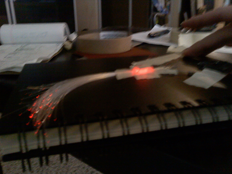 The biggest problem I’ve run into was that my fibers were too fine. They conduct the light just fine, but their visibility is low. Pushing them into place was a pain, as I had to place each one, one by one, into a template made out of poster board. The other problem was that I had bundled and glued together all the fibers BEFORE doing so. It made it harder to get them into place properly. Next time, they should be put into place first.