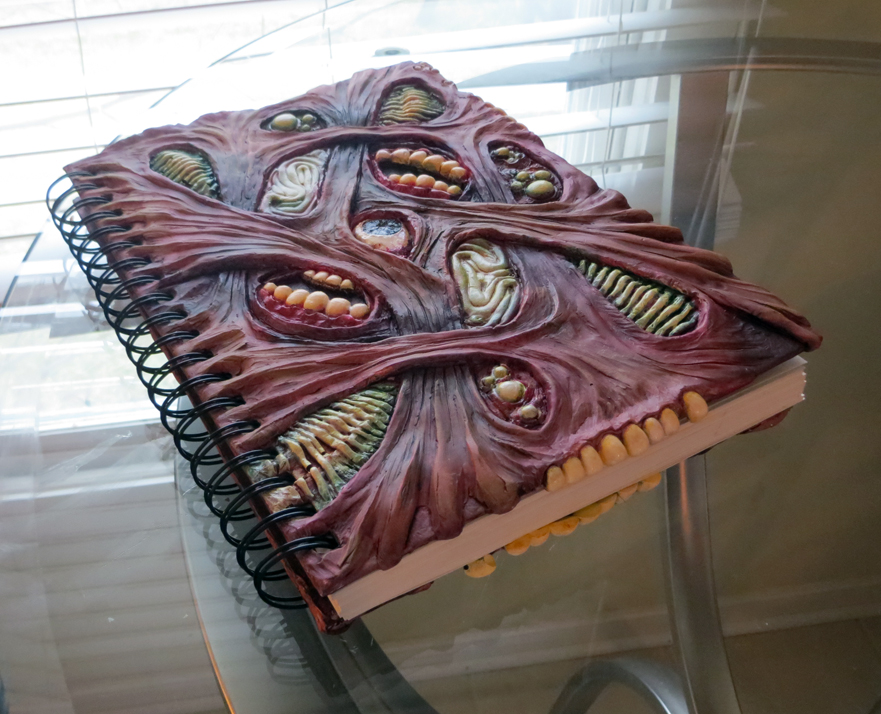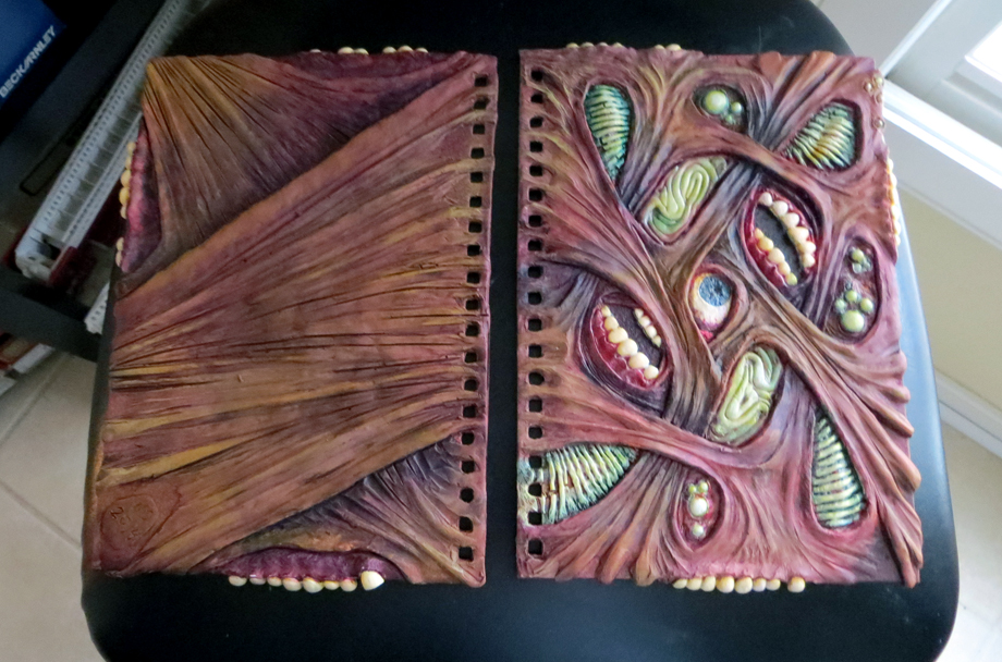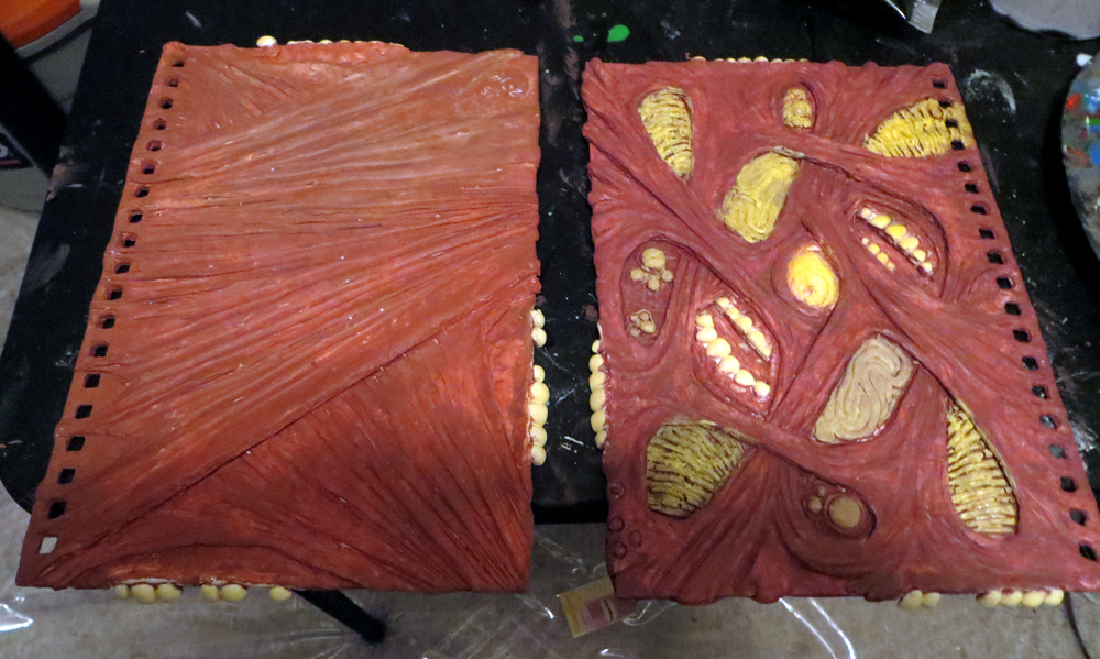 The process: Firstly, I pulled the original cover off the book and sealed it. Next was the sculpting. I used plastalina clay- oil based, and never-hardening. Through trial and error I arrived at my final design. Rachel, from over at Maewyn’s, helped me with the casting process. Once the sculpt was done, it was boxed in with leftover clay, and silicone was poured to make the mold. After that set, we pulled the silicone mold off the sculpt and cleaned out the stuck clay. Next was pouring the resin. It cures much faster than the silicone, and I soon had a new, plastic cover for my book! I had to clean up overflow and edges on the thing. I used a dremel and a drill to clear out the holes for the binding, and a utility knife to cut the overflow on the edges. After that, I sanded down all the edges and sanded the interior sides so it would take paint better. Painting was done with familiar techniques- Thin washes to work dark colors into the crevices, and dry brushing to highlight the peaks.